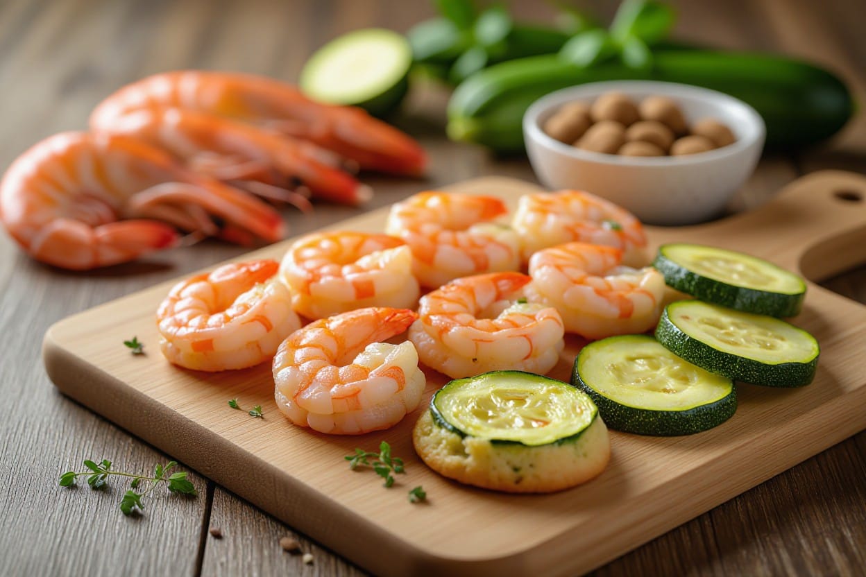 1/2 cup cooked, peeled, deveined shrimp (finely chopped), 1/3 cup grated zucchini (squeezed of excess water), 1 large egg, 1/2 cup oat flour (or pulse 1/2 cup rolled oats into flour). Use plain, unseasoned shrimp; do not include shells, tails, or any onion/garlic seasoning — those are dangerous for cats.