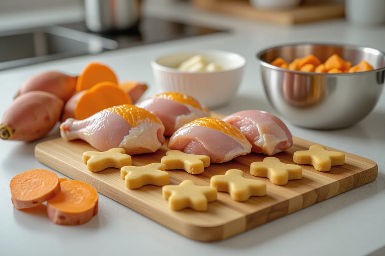 1 cup cooked lean turkey (shredded, no skin, no bones), 1/2 cup cooked mashed sweet potato (plain, no added salt or sugar), and 1 large egg — a true set of 3 ingredient cat treats that deliver lean protein and fiber. These quantities make about 25–35 small chews; turkey supplies the bulk of the protein while sweet potato adds palatable sweetness and binding starch.