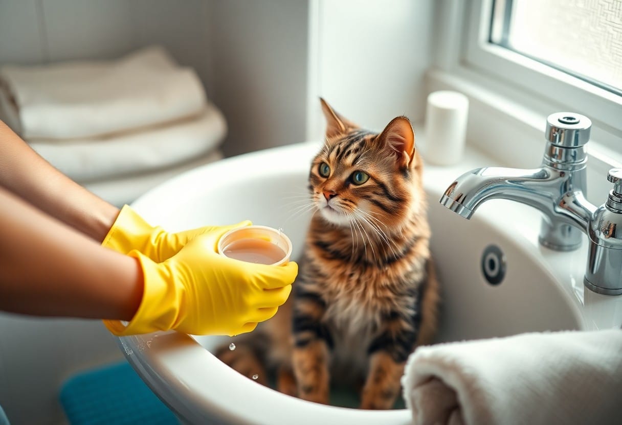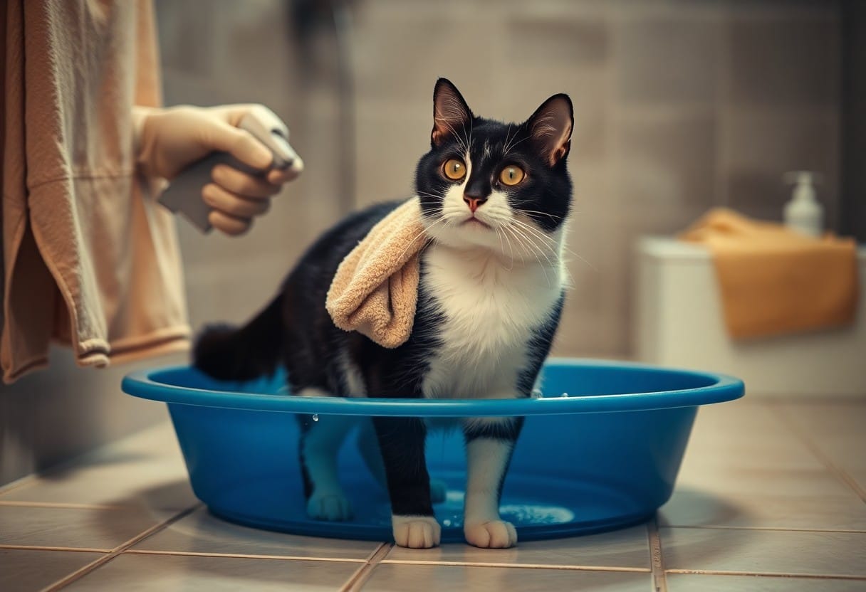 Position the mat so your cat’s paws grip edges; move slowly and speak softly as you use a handheld sprayer on low flow, aiming at fur and avoiding ears and eyes. When your cat freezes, stop and soothe them with a towel and treats; keep one steady hand to prevent sudden lunges.