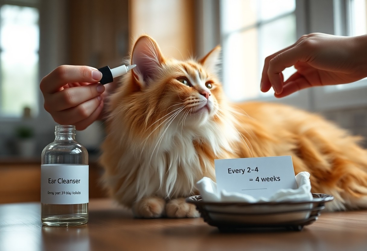 You should inspect your cat’s ears weekly and only clean when you see excessive wax, dark discharge, or a foul odor; routine cleaning every 2-4 weeks fits many cats but increase frequency if your cat has allergies or a history of ear infections. Use a gentle vet-approved cleanser and avoid cotton swabs. If you notice head shaking, scratching, or swelling, or if signs worsen over 48-72 hours, seek veterinary care to rule out ear mites or bacterial/yeast infections.
