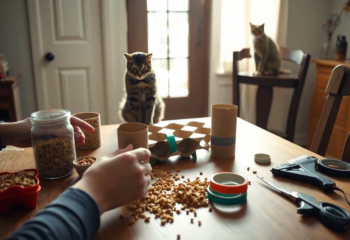Considering all points, you can safely create varied DIY foraging toys that slow feeding, stimulate hunting instincts, and prevent boredom; test materials for safety, monitor play, and adjust difficulty to match your cat’s skills so you maintain healthy eating habits and mental stimulation without extra expense.