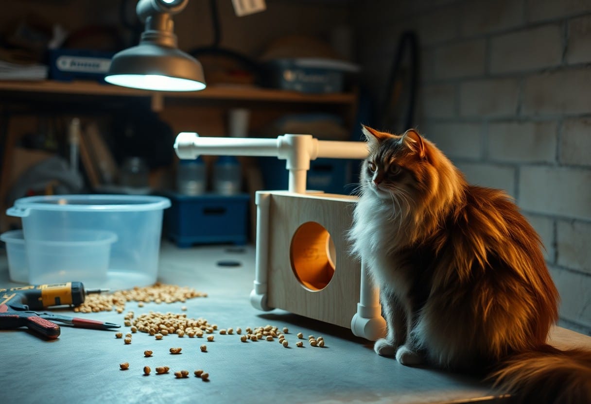 Measure spacing for your kibble size and cut stacked tubes or boxes so treats move but don’t fall freely; you should add adjustable baffles to tune difficulty and secure to a wall or heavy base to stop tipping. Test with small treats, sand smooth interiors, and fasten every joint-avoid loose screws or small parts that could cause choking; this design controls feeding speed and increases mental challenge.