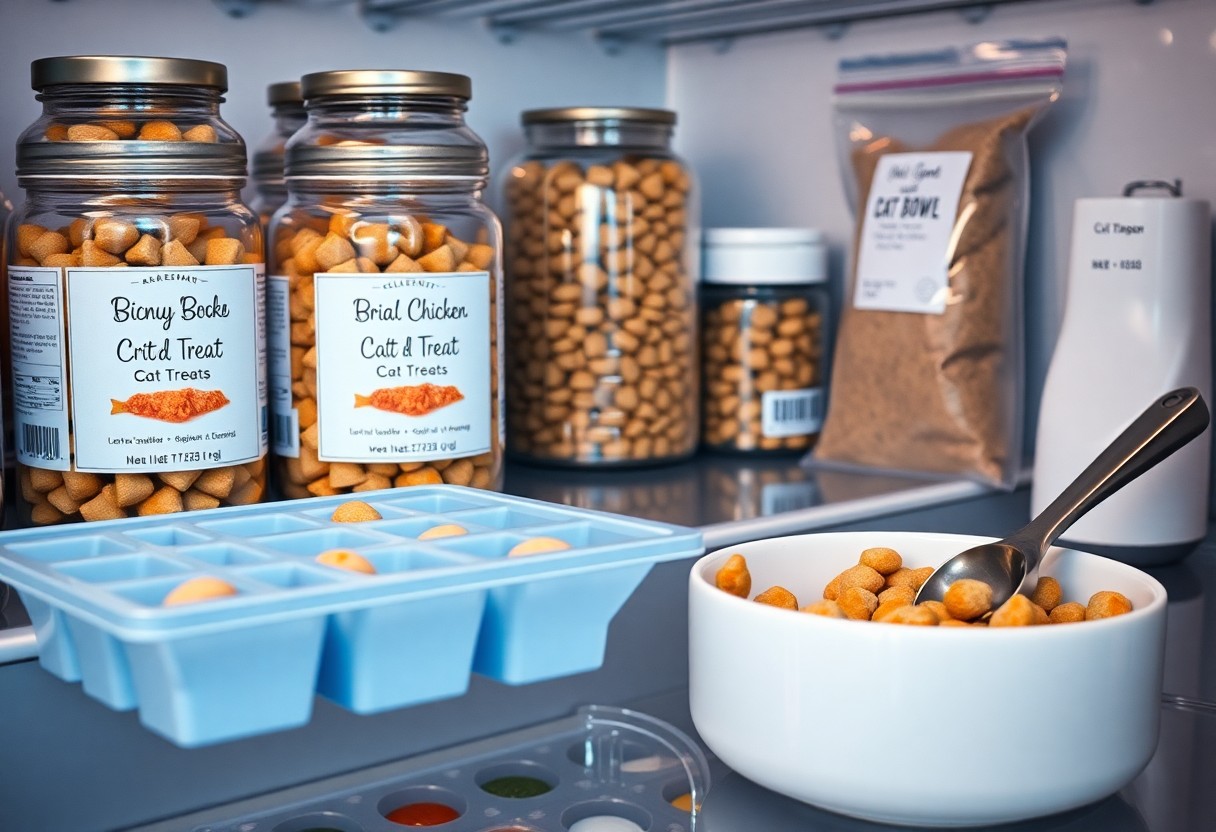 A: Storage: Refrigerate moist/baked treats in an airtight container for up to 4-7 days; freeze portions up to 3 months and thaw in the refrigerator before use. Fully dried jerky can be kept in the refrigerator for 1-2 weeks or frozen for longer. Feeding frequency: treats should be occasional and make up no more than about 10% of your cat’s daily calorie intake-typically a couple of small pieces per day for most cats. Watch for food sensitivities: chicken and fish are common allergens. Introduce a new recipe slowly (small amount daily for 3-5 days) and stop if you see vomiting, diarrhea, itching, or ear issues. Consult your veterinarian if your cat has dietary restrictions, weight concerns, or chronic health issues.