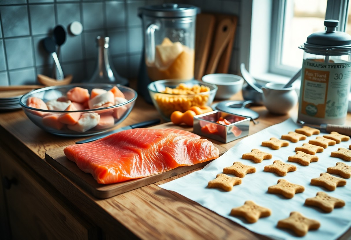 Flake 1 cup cooked, deboned salmon, mix with 1 egg and ½ cup chickpea or oat flour, then drop teaspoonfuls on a sheet and bake at 350°F (177°C) for 10-12 minutes until firm. These yield roughly 18-22 small bites rich in EPA/DHA omega-3s for skin and coat benefits. Always use cooked salmon because raw salmon can contain thiaminase, an enzyme that destroys vitamin B1.