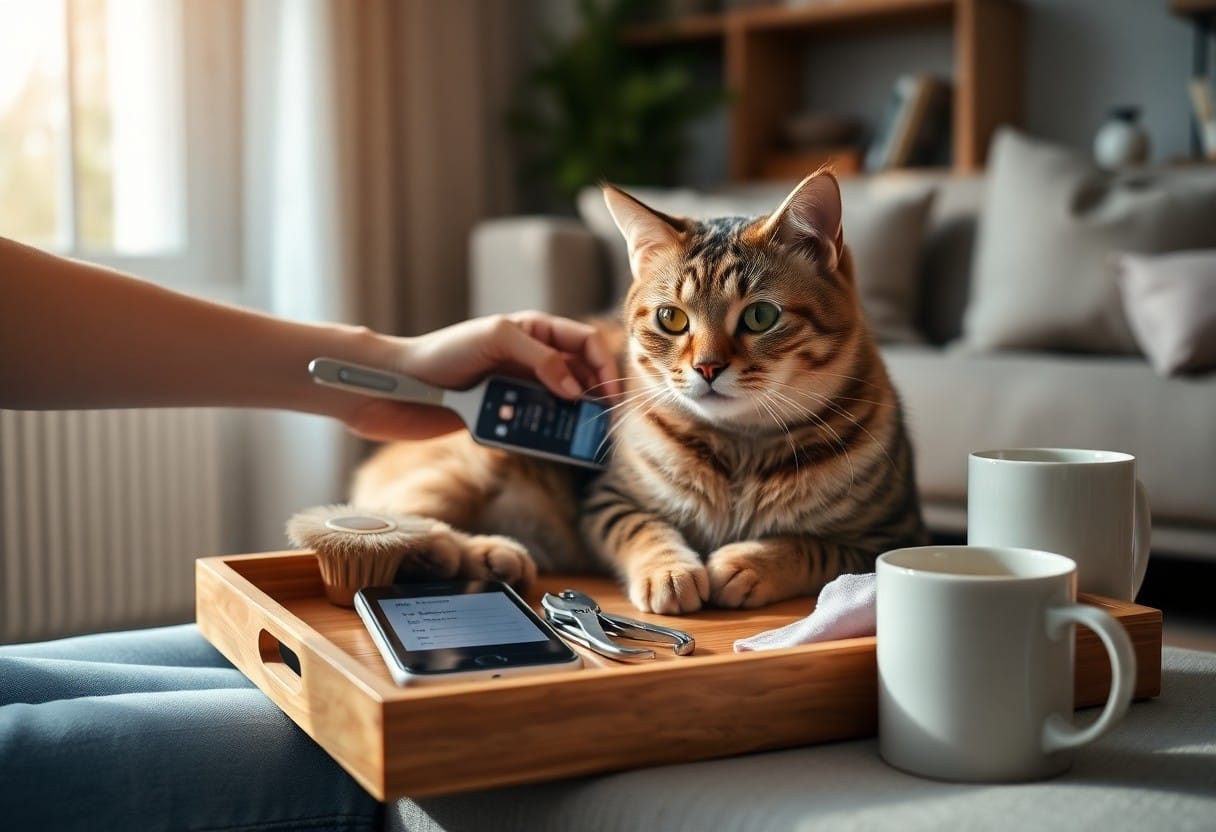 Use short, focused sessions to keep grooming under 5 minutes most days: a quick brush after meals, nail checks once weekly, and a full comb-through 2-3 times per week for long-haired cats. Keep a small caddy with a slicker brush, grooming glove and wipes by the door so you can act fast. When you pair grooming with feeding or play, you cut handling time and reduce resistance, letting you maintain coat health without long sessions.