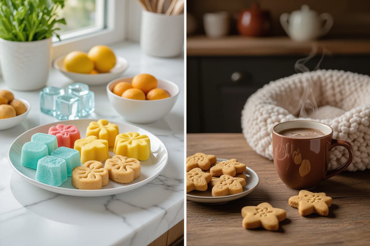 Treats can be functional tools: cooling treats for cats—iced tuna-water cubes, frozen pureed chicken in silicone molds, or chilled slices of wet food—help lower surface temperature and increase hydration in summer. In winter, winter warming cat treats such as warmed bone broth (low-sodium) or gently heated meat purees provide comfort and raise peripheral circulation, encouraging intake in cold-sensitive cats.