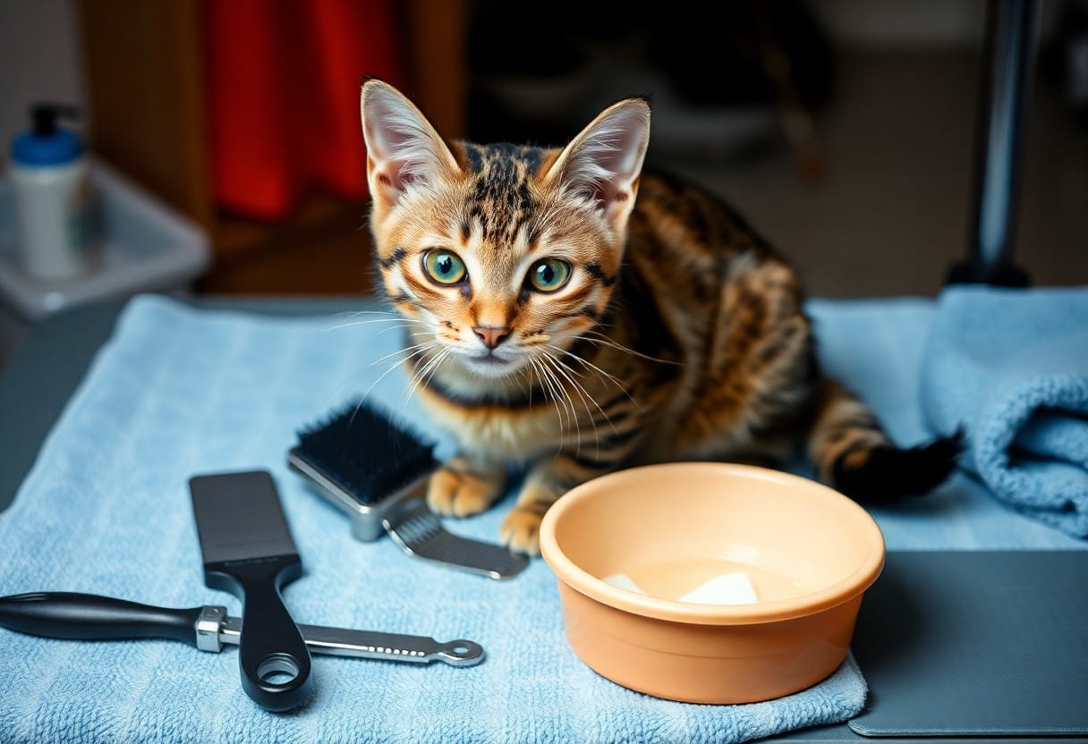 Step 3 – Bathing (only when necessary): Fill a sink with a few inches of warm water, support your cat securely, wet the coat quickly, apply a tiny amount of cat shampoo and rinse thoroughly. Avoid the eyes and ears. Wrap your cat in a towel and blot dry; use a low-heat dryer only if your cat tolerates it.