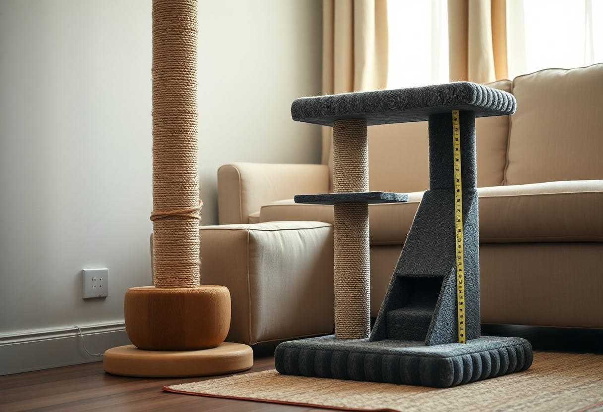 Measure your cat fully stretched-many adults extend 18-28 inches; match post height so they can stretch vertically and anchor taller posts to walls to prevent tipping. For high-value pieces, place a post within 2-3 feet and temporarily protect edges with clear plastic guards while retraining. Monitor progress over 2-4 weeks and relocate posts if ignored-placement often matters more than aesthetic style.